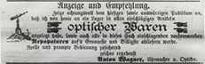 1884 - Uhrmacher und Optiker Anton Wagner eröffnet in Dillingen, Königstrasse 11 einen Uhren und Optikladen Historische Annonce von Optik Wagner Dillingen.